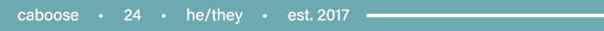 08. MUSE AGES. in regards to the majority of my muses , there varying ages i write them despite most of their canon representation being children . this will never be done for the sake of shipping with muses that are not similarly aged canonically . the only reason any of my child muses will be written aged up is for passage of time in threads . for example , my portrayal of omega ( star wars: the bad batch ) has a verse interpreting her life both at the height of the rebellion and after the empire falls .09. ANON HATE & TRANSPHOBIA. neither will be tolerated on this blog . i write a diverse cast of canon & oc characters who i care deeply care for . i myself am a transguy myself . any hate or phobic will be deleted & blocked . that being said , unless i change my mind , anon is permanently disabled on this blog . i’ve already dealt with too much to allow the risk of it .10. REPLIES. replies have equal chances of being either really fast or really slow . i promise this has nothing to do with you ! i personally deal with a lot of mental illness & tend to forget things often . that being said ! if you think i may have forgotten a thread , always feel free to message me to make sure ! i will always do my best to message you if i want to drop a thread . at the very least i will have a post stating my absence or any temp. hiatuses .11. TRIGGERS. i will most definitely tag any triggers you have ! just shoot me a message privately or via ask ( i’ll answer privately ) and i’ll add it to my list without question ! my own personal triggers are : **incest , csa , rape , sexual abuse , trypophobia , & graphic eye/hand horror **.12. FORMATTING. i personally write small font , lowercased , with one extra space between punctuations with no icons . instead of icons i used custom character text breaker graphics edited by me with various psds ! you do not have to match it ! i understand it's kind of a weird aesthetic thing to go for and often times isn't grammatically proper . and sometimes , it's not for everyone ! i just like the way it looks personally . however if the way i format is difficult for you to read ( i.e. lowecased , small text ) , i'm happy to adjust it for our threads ! just let me know what's easiest for you and i'll add it to my notes to remember for our future writing <313. OOC. all ooc posts will be tagged #☄「ooc.」 . i do tend to post a lot of ooc , so feel free to blacklist it ! as for discord , it will be handed out to mutuals on a case by case basis . this is due to personal experiences with being overwhelmed by the amount of people i come into contact with ! it’s nothing personal <3 you’re always welcome to IM me via tumblr or ask for another mode of contact otherwise.a bit of an addition , i am on the autistic spectrum . so some things may need a little more clarification for me ! i try to ask for carification and use tonal indicators a lot now , but sometimes i may get a little confused still . please bare with me ! i really appreciate it . and while i may not understand the nature of how i may come across sometimes , please don't be afraid to let me know if i say / do something that bothers you . i want all of us to be comfy and have fun ! and if you have any concerns with some of the people i write with , please either approach me informatively or feel free to block me . i do appreciate a heads up know someone is known to write anything generally frowned upon !14. MUN. and lastly ! hi there \o/ i'm caboose ! thank you so much for reading all my rules . i'm an illustration graduate that will hopefully do something with storytelling ! if it isn't obvious from my muse list , i love cartoons , robots , and comics . and i look forward to writing with you guys !!!previous urls i have been found include : overgrcwth, bcdtiimes, __vanderpink __ / strcngestweb, arkburied, littlcbox, childiishpan, thereseatchinginformant, & hcrbivoriccare .